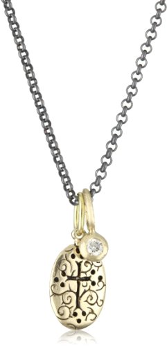 These charms are removable and can be worn alone or together The sterling silver oxidized cable chain has an adjustable extender with a delicate raspberry drop at the end. 18"-20" Erica's 14k double cross features a beautiful engraved swirl pattern as a background with just the opposite dramatic relief on the other side, paired with a 14k diamond dot Made in United States Hung on an oxidized chain for an amazing contrast