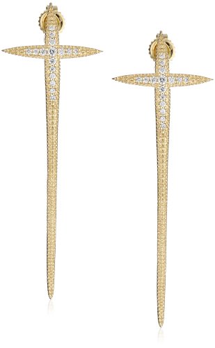 14k Gold post for pierced ears Long Cross earrings with the shape of Mizuki's signature icicles, has a unique style. Simply Stunning A classic yet edgy earring for women with flair! Made in Thailand Curved long icicle charm cross with white diamonds .16ct
