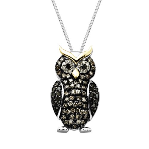XPY Sterling Silver and 14k Yellow Gold Diamond Owl Pendant Necklace, 18" Feature
