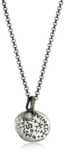 Keeping with the organic feel, the highlight of this piece is the multi size diamonds set on the disc These charms are removable and can be worn alone or together, all hand finished Erica's organic oxidized sterling silver disc is covered with symbols and latin phrases "vincit omnia veritas" or the truth conquers all and "veritas vos liberabit" or the truth will set you Ree", and paired a 9pt diamond dot The 23" oxidized sterling silver cable chain is the perfect match Made in United States