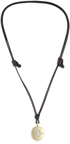Diamond encrusted starburst medallion .59CT. White diamonds make up the shape of the starburst which is pressed against a 14K Gold medallion Made in USA Mizuki's classic adjustable 28" brown leather cord with 14K Gold diamond starburst medallion is a versatile piece that can be worn at different lengths A great mix of materials! Total weight of necklace is 11.9 grams Adjustable 28" brown leather cord
