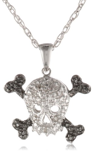 Sterling Silver Black and White Diamond Skull Pendant Necklace