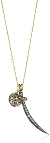 Three removable 14K gold diamond charms .39Ct . Mizuki's signature ball is finished with a unique brush texture. Three charms: Crescent length 2.12 inches width .16 inches Four leaf charm length .83 inches width .65" Round ball cross 14mm. Total weight of necklace 14.3 grams Mizuki's 14K Gold adjustable chain comes with three unique 14K gold charms blackened with diamonds Four leaf cross, diamond crescent and round ball square bar cross Domestic 14K Gold wheat chain is adjustable This versatile necklace can be worn as 18" or 26"
