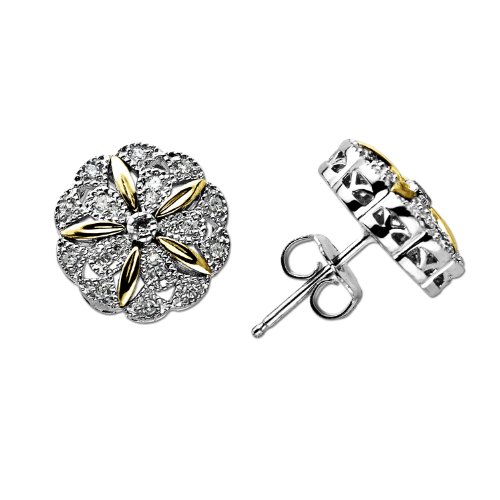 S&G Sterling Silver and 14k Yellow Gold Vintage Flower Design with Diamond Accent Stud Earrings
