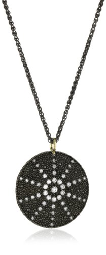 Almost a carat of glistening white diamonds outline the shape of a starburst pressed against a blackened silver medallion, which makes the diamonds really pop This large sized medallion is sure to be a statement all on its own! The ten point s of the starburst are outlined in beautiful white full cut diamonds and surround a circle of sparkling white diamonds .97ct The 25" blackened silver wheat chain that can be worn separately, is a perfect length to showcase this beautiful medallion on Imported