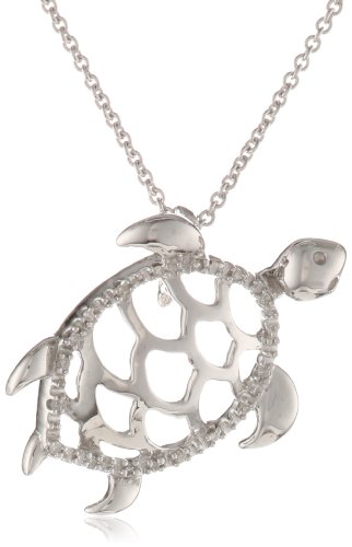This charming sea turtle pendant is detailed with a total of 18 diamonds The sea turtle is an ancient symbol of strength and wisdom and a popular good luck charm The pendant slides along an 18-inch sterling silver rolo chain Imported