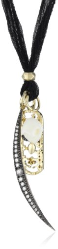 Adjustable black chiffon can be worn up to 40" long The length can be changed by moving the faceted gold bead up or down or knotting the material at different lengths Three removable charms total diamond weight .28CT. Crescent with rose cut diamond center surrounded by full cut diamonds and blackened finish .2CT worn with black diamond love tag .08CT and white coral skull Total weight of necklace is 9 grams. Chiffon is 40" in length. Three charms: coral skull length .75 inches width .33 inches, Love tag length 1 inch width .41 inches, crescent length 2.12 inches width .16 inches Mizuki's signature 40" chiffon necklace with gold faceted slider comes with three edgy charms: a diamond crescent, a black diamond love tag & a white coral skull Domestic